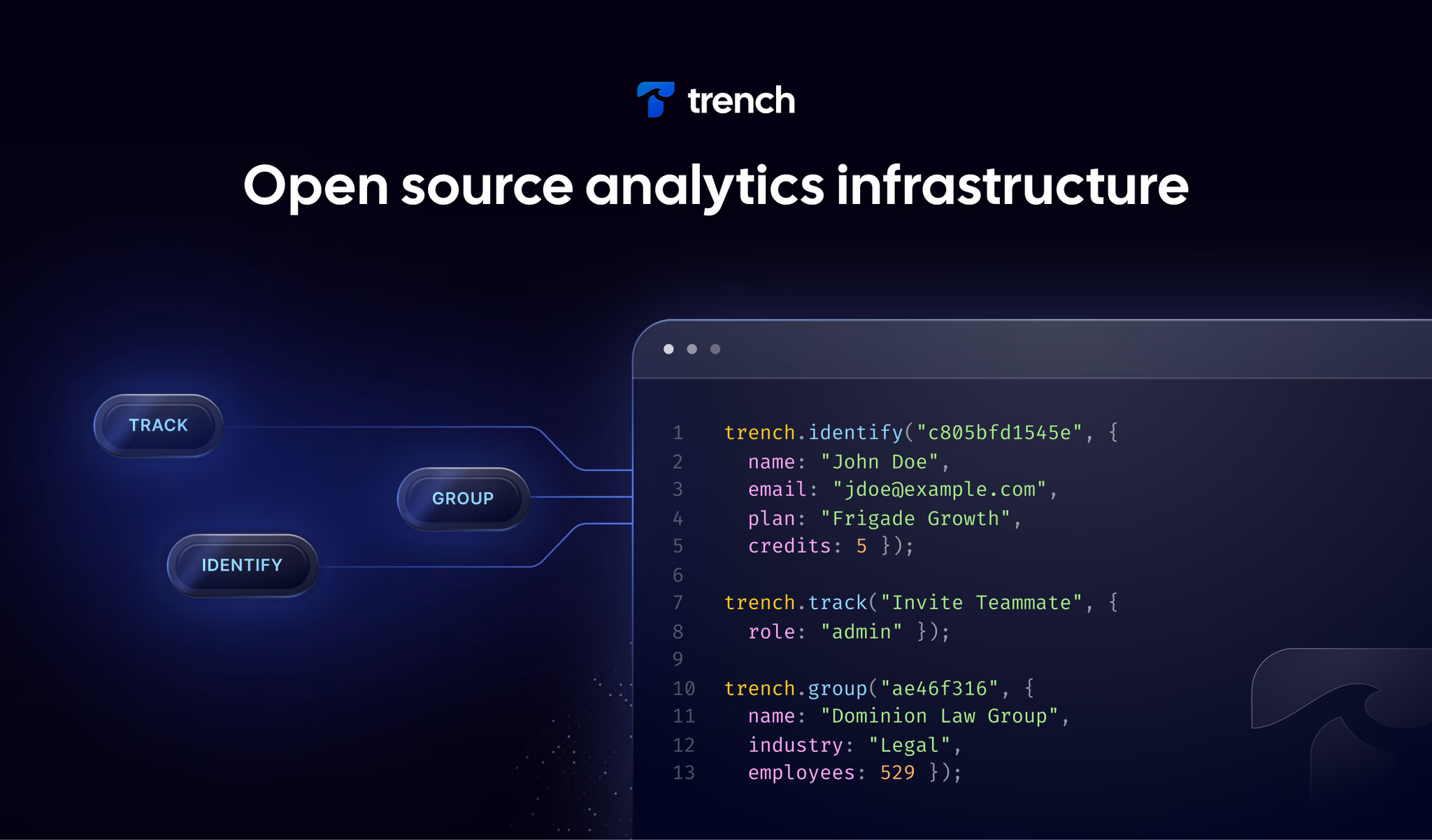 - Segment API Compatible: Trench is compliant with the Segment API, supporting Track, Group, and Identify calls.